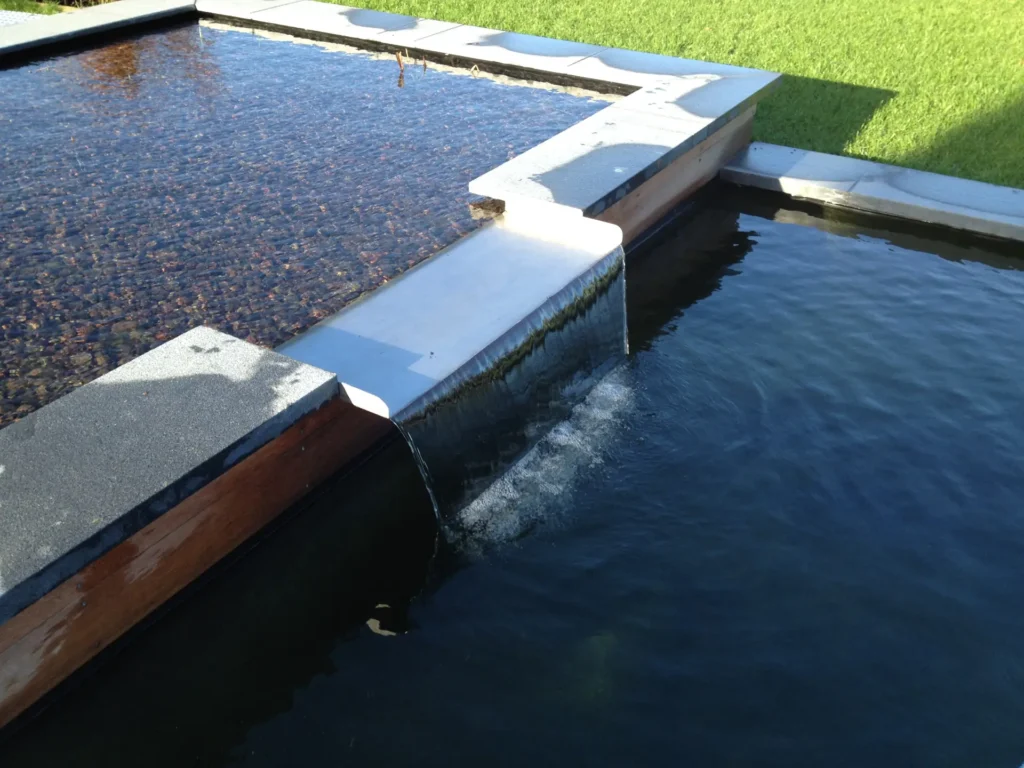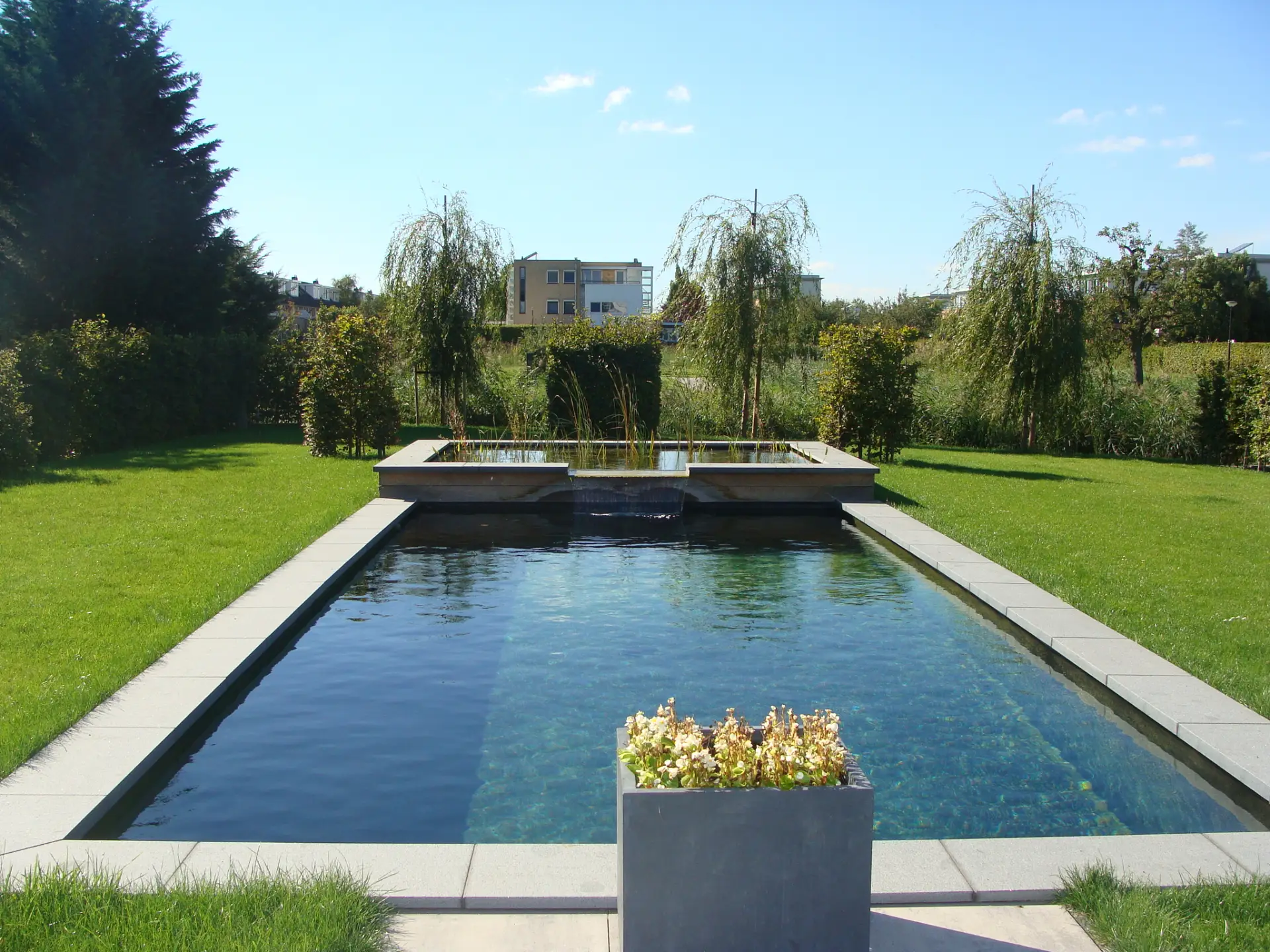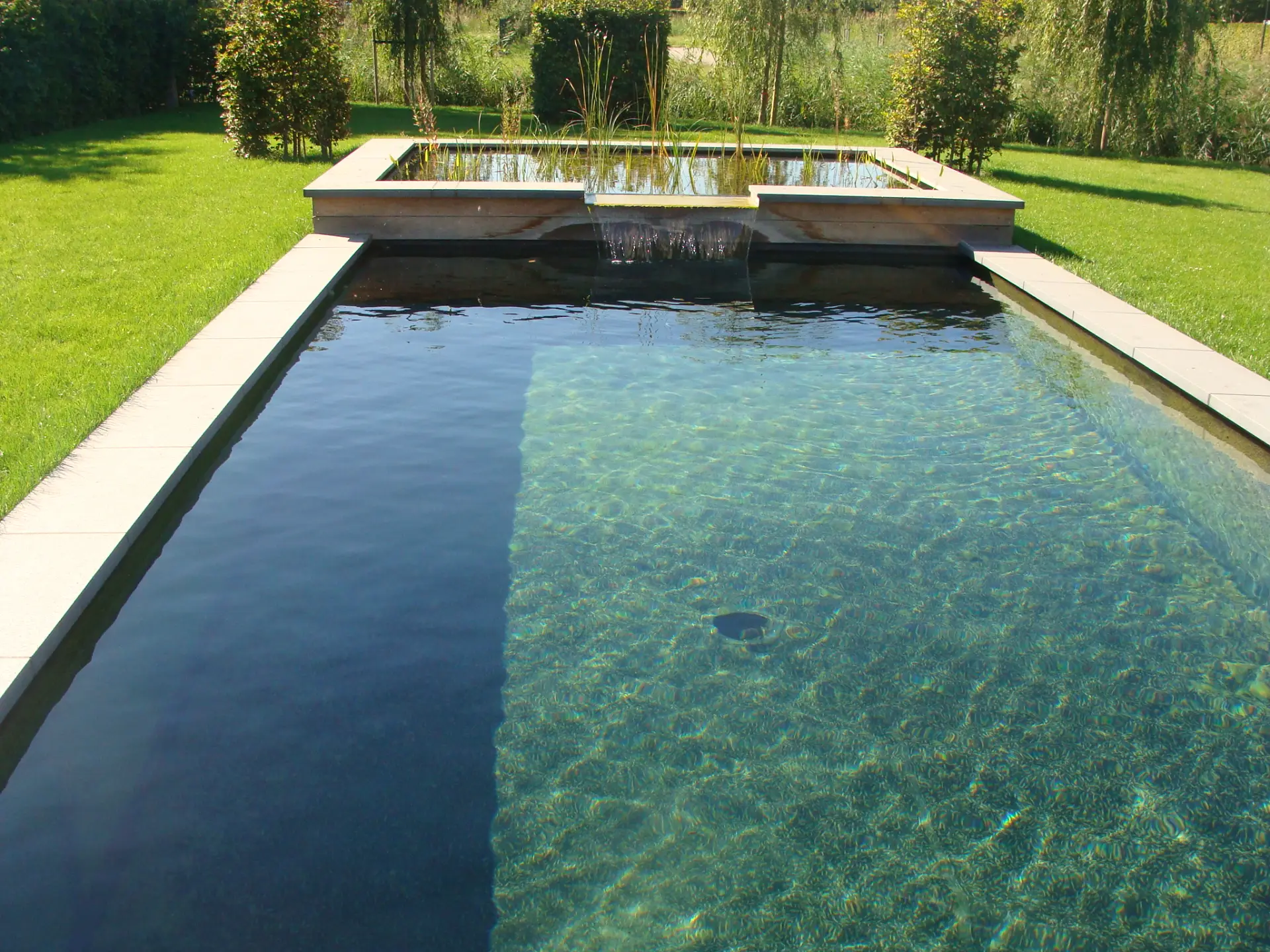Het opvallende element in dit ontwerp is het verhoogde filterbed. De waterplanten in dit gedeelte nemen de voedingsstoffen op uit het water, waardoor algen geen kans krijgen en het zwemgedeelte kristalhelder blijft. De rvs-overloop zorgt voor een constante, subtiele waterval. Dit ziet er niet alleen modern uit, maar de kabbelende waterval brengt ook extra zuurstof in het water en een rustgevend geluid in de tuin.