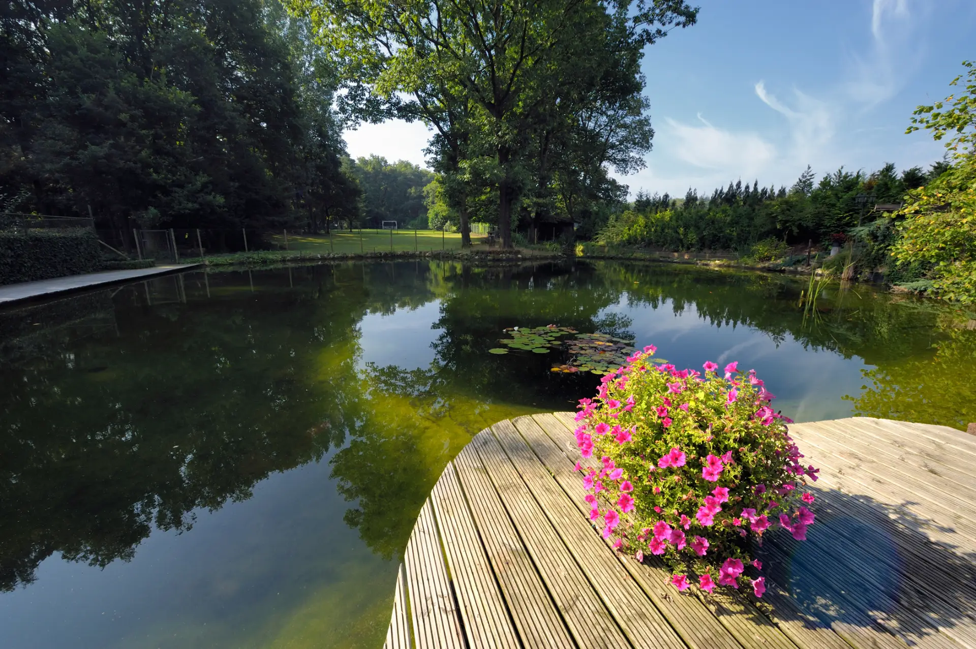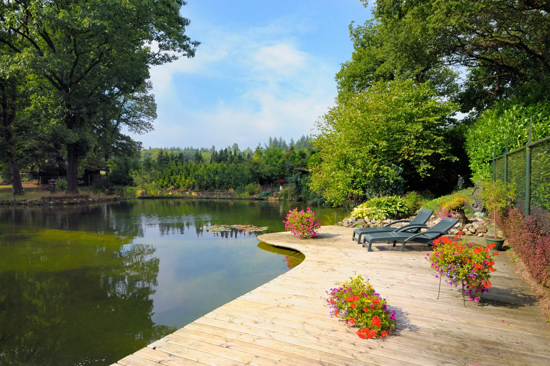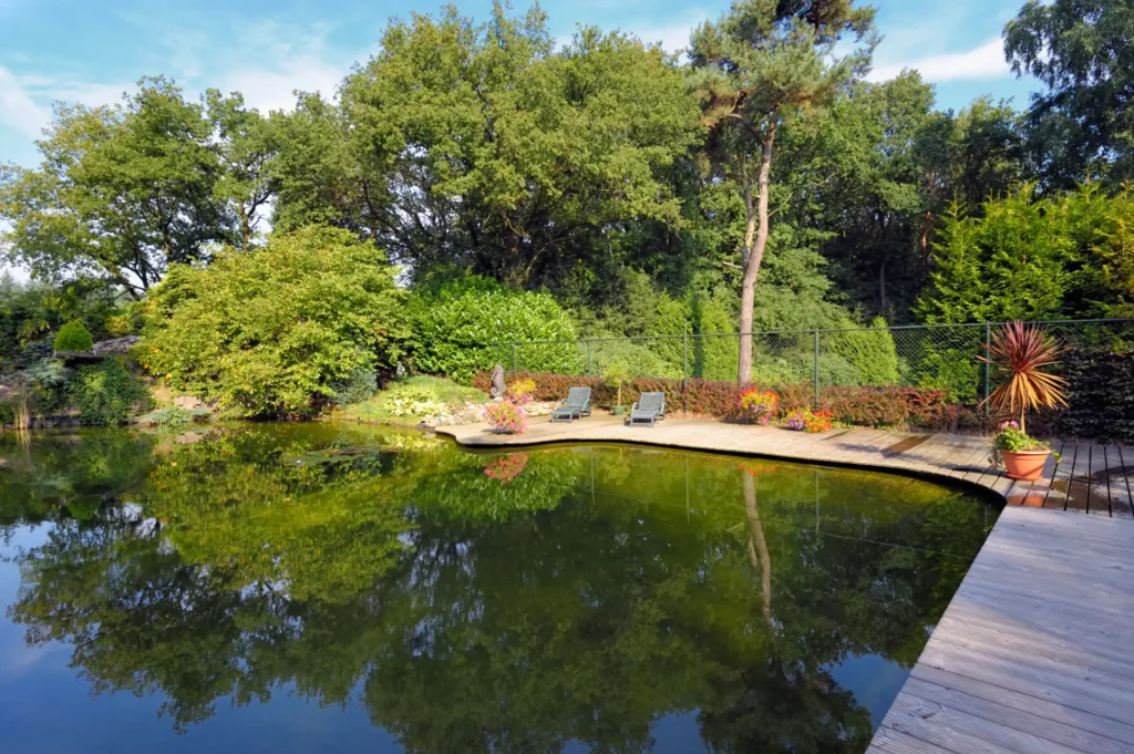 Natuurlijke zwemvijver met organische vlonders in Garderen